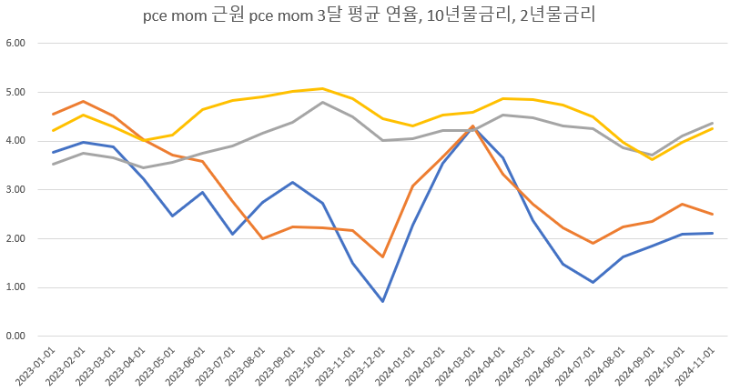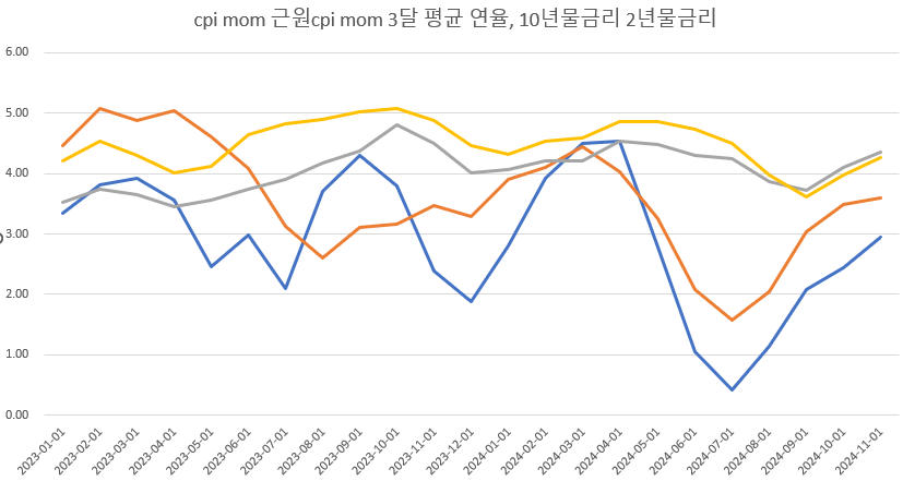 제가 그제 쓴 '3달 물가mom평균으로 시장금리(월평균) 고점 파악하기'글에서 기준금리 영향이 배제된 2023년 7월 이후 물가 mom 3달 평균 연율 환산한 그래프의 변곡점이 있은 후 1,2달 후에 시장금리 월평균의 변곡점이 오는 것을 볼 수 있다고 하였습니다. 그래서 이번에 물가 mom 3달 평균 연율 환산한 것이 고점 찍고 내려오면 1,2달 후에 시장금리 월평균도 고점을 찍고 내려올 수 있겠다 짐작을 할 수 있겠다 애기했습니다. 이번 글은 그냥 호기심에 과거 인플레 시절에 cpi mom 3달 평균 연율 환산한 것과 10년물금리 월평균을 비교해보고 싶어서 쓰는 글입니다. 그림에서 녹색박스는 1993년 이전에는 물가상승률이 4%이상, 1993년 이후에는 3%이상인 때를 표시한 것입니다. 24년6월 이..