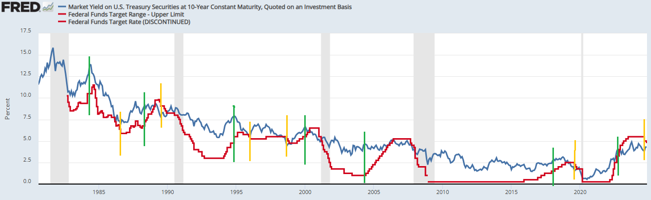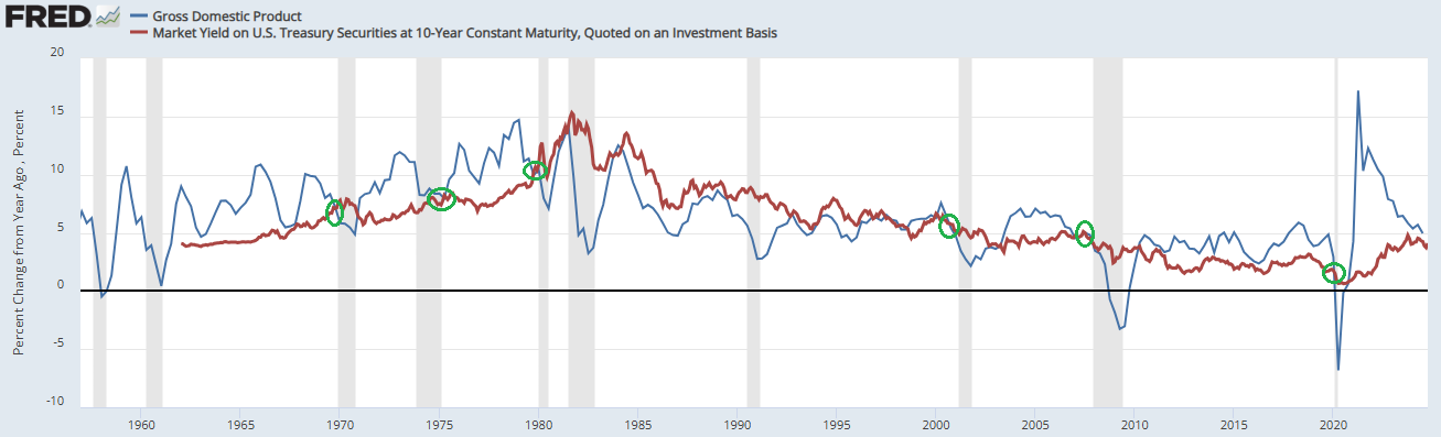 명목gdp전년동기비는 실질gdp전년동기비+평균pce물가상승률(분기)입니다.보통 경제성장률은 실질gdp전기대비를 연율환산한 것을 말하는데 이게 등락이 심합니다.그래서 경제성장률 대신에 실질gdp전년동기비를 보기도 합니다. 그림은 명목gdp전년동기비가 10년물금리를 데드크로스 할 때를 녹색원으로 표시했고 1965년 이후 6번이 있었음을 볼 수 있습니다. 데드크로스가 있을 때 명목gdp전년동기비를 표시했고 이때 10년물금리를 표시했는데 gdp특성상 1,4,7,10월 10년물금리와 비교하여 월평균 금리를 기록하였습니다. 1975년 빼고는 데드크로스가 있고나서 침체가 왔음을 볼 수 있습니다. 그리고 이때가 07,20년 빼고는 10년물금리 고점과도 가까운 것을 볼 수 있습니다. 지금 24년3분기 명목gdp전년동기..