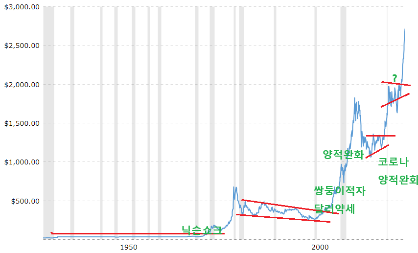 골디락스로 대표되는 기간이 1994년 금리인상 후 보험적 금리인하가 있었던 1995년입니다. 이때는 10년물 금리가 상승할 때 지수는 횡보하고 10년물 금리가 하락할 때 지수는 상승해서 결과적으로 지수가 상승했습니다. 올해 1분기와 9월 중하순은 첫금리인하로 인해 지수가 상승했던 모양을 띄었습니다. 올해 5월 중순에서 7월 중순, 8월 중하순, 10월이 1995년과 같은 골디락스 모습을 보여주었습니다. 앞으로 10년물 금리가 4.3%를 넘었을 때 골디락스 모습을 보여줄지는 지켜봐야 하지만 주식시장에서는 지금을 골디락스로 보고 있다고 볼 수 있습니다. 보통 골디락스 때는 금값은 하락하였습니다. 1995년에 금리인하 후 금값은 횡보하다가 금리인하효과로 미국경제가 잘나가 달러가 강세로 가니 1996년 이후 금..