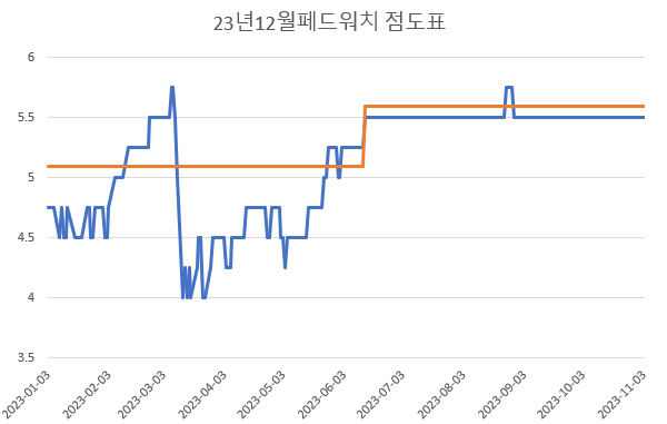 30 days federal funds 상품을 통해 향후 fomc에서 통화정책 변화 가능성을 볼 수 있다고 시카고 선물거래소 홈페이지에 써있습니다.파란선은 23년12월 24년12월 금리 트레이더들이 예상하는 향후 기준금리 중에 다수이고 주황색은 fomc 23년,24년 금리전망입니다. 23년3월 기준금리는 4.75%였고 이때 연준의 22년12월 fomc 23년 금리전망은 5.1%였습니다.이때 은행문제가 생기자 23년12월 페드워치는 4.75%에서 5.75%까지 금리인상 4번 베팅에서 오히려 4.75%에서 4%로 금리인하 3번 베팅으로 바뀐 것을 볼 수 있습니다.시장이 예상하는 금리변동폭이 7번이 반영되었습니다. 은행문제로 연준이 점도표와 시장 사이의 괴리가 벌어졌다가 은행문제가 수면 아래로 가라앉고 물가..
