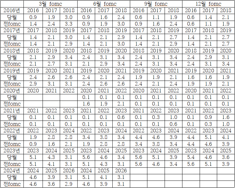 연준 홈페이지에서 fomc 물가전망 금리전망 자료는 최근 5년치만 보여줍니다.위 표에 2016년에서 18년까지 점도표 금리전망 자료가 있는 것은 제가 전에 연준 홈피를 보고 정리한 자료가 있어서입니다.2016년에서 18년까지 물가전망 자료도 알고 싶은데 유감스럽게도 연준 홈페이지에 없습니다. 표에서 ↑는 전fomc때보다 물가전망 금리전망이 상향되었을 때 표시했습니다. ↓는 전fomc때보다 물가전망 금리전망이 하향되었을 때 표시했습니다. →는 전fomc때와 물가전망 금리전망이 같을 때 표시했습니다 상향 하향 표시할 때 3.6,9월 fomc는 그해와 내년 전망만 참고하고 내후년 전망은 참고하지 않았습니다. 상향 하향 표시할 때 12월 fomc는 그해 전망은 참고하지 않고 내년과 내후년 전망을 참고하였습니다..