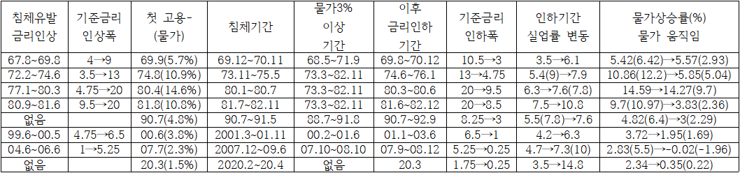 위 표를 보는 방법입니다. 침체유발 금리인상의 예를 72.2~74.6을 들면 72년2월에서 74년6월까지 금리인상을 3%에서 13%까지 가져갔고 이로 인해 비농업고용지수가 74년8월에 첫 마이너스가 났고 74년8월 물가가 10.9%이었음물가 3%(93년전 4%)이상 고용 마이너스로 인한 침체로 인한 침체 기간이 73년3월에서 75년5월까지였음당시 물가 3%(93년전 4%)이상이었던 기간이 73년3월에서 82년11월까지였음고용이 안좋으니 금리인하를 74년6월부터 76년1월까지 가져갔는데 인하폭이 13%에서 4.75%였음이때 침체와 금리인하 영향으로 실업률이 첫인하당시 5.4%에서 9%까지 올랐다가 마지막인하때 7.9%까지 내려갔음이때 침체와 금리인하 영향으로 물가는 첫인하당시 10.86%에서 12.2%까지..